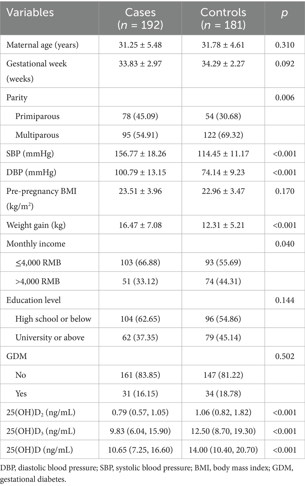 The characteristics of the participants are presented in Table 1. There were no significant differences between the cases and controls in terms of maternal age, gestational week, pre-pregnant BMI or education. However, compared with controls, women with preeclampsia had a higher SBP, DBP, greater weight gain during pregnancy, a higher income level, and significantly lower serum concentrations 25(OH)D2, 25(OH)D3 and 25(OH)D. Additionally, primiparous women were more likely to suffer from preeclampsia than multiparous women.