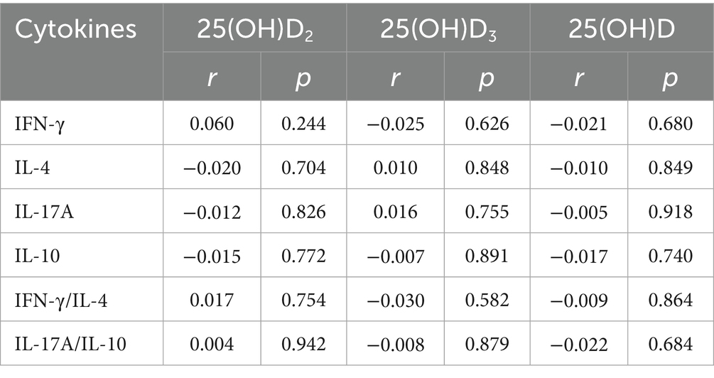 For normally distributed data, Student’s t or Wilcoxon test were used to compare continuous parameters between the cases and controls, and chi-squared tests were conducted to compare differences in qualitative variables between cases and controls. Spearman’s correlation was used to analyze the correlations between vitamin D concentrations and immune parameters.