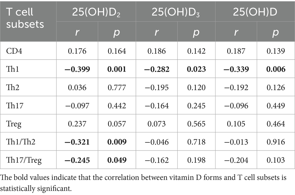 The correlations of the vitamin D concentration with T cell subsets and the immune balance status are presented in Table 3. The vitamin D concentration was associated with Th1 cells, with correlation coefficients of r = −0.399 (p = 0.001), r = −0.282 (p = 0.023), and r = −0.339 (p = 0.006) between Th1 and 25(OH)D2, 25(OH)D3 as well as 25(OH)D, respectively. In the correlation analysis between vitamin D and immune balance of T cell subsets, only 25(OH)D2 was found to be associated with Th1/Th2 as well as Th17/Treg, the correlation coefficients for the associations 25(OH)D2 with the Th1/Th2 and Th17/Treg ratios were r = −0.321 (p = 0.009), and r = −0.245 (p = 0.049), respectively. The correlations between T cell subsets and preeclampsia were showed in Supplementary Table 6.