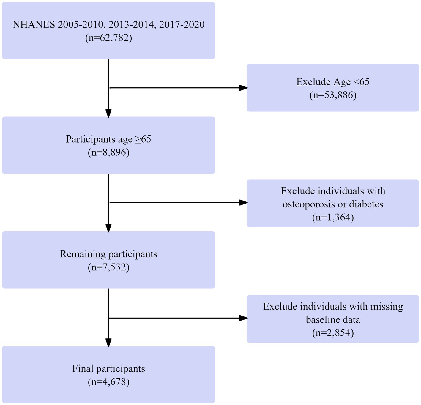 Data were drawn from the 2005–2010, 2013–2014, and 2017–2020 NHANES cycles, including 62,782 individuals. These particular cycles were chosen because they encompass all available recent NHANES data cycles that contain both dual-energy X-ray absorptiometry (DXA) measurements for bone mineral density assessment and the detailed dietary data from 24-h recalls required for our multidimensional dietary assessment. Those under 65 years were excluded (53,886 removed), leaving 8,896 participants aged ≥ 65. Next, 1,364 individuals with missing diabetes or osteoporosis data were excluded, resulting in 7,532 participants. Finally, 2,854 individuals with missing baseline data were removed, yielding a final cohort of 4,678 participants with complete data on age, diabetes/osteoporosis status, and baseline measurements. The screening process is shown in Figure 1.