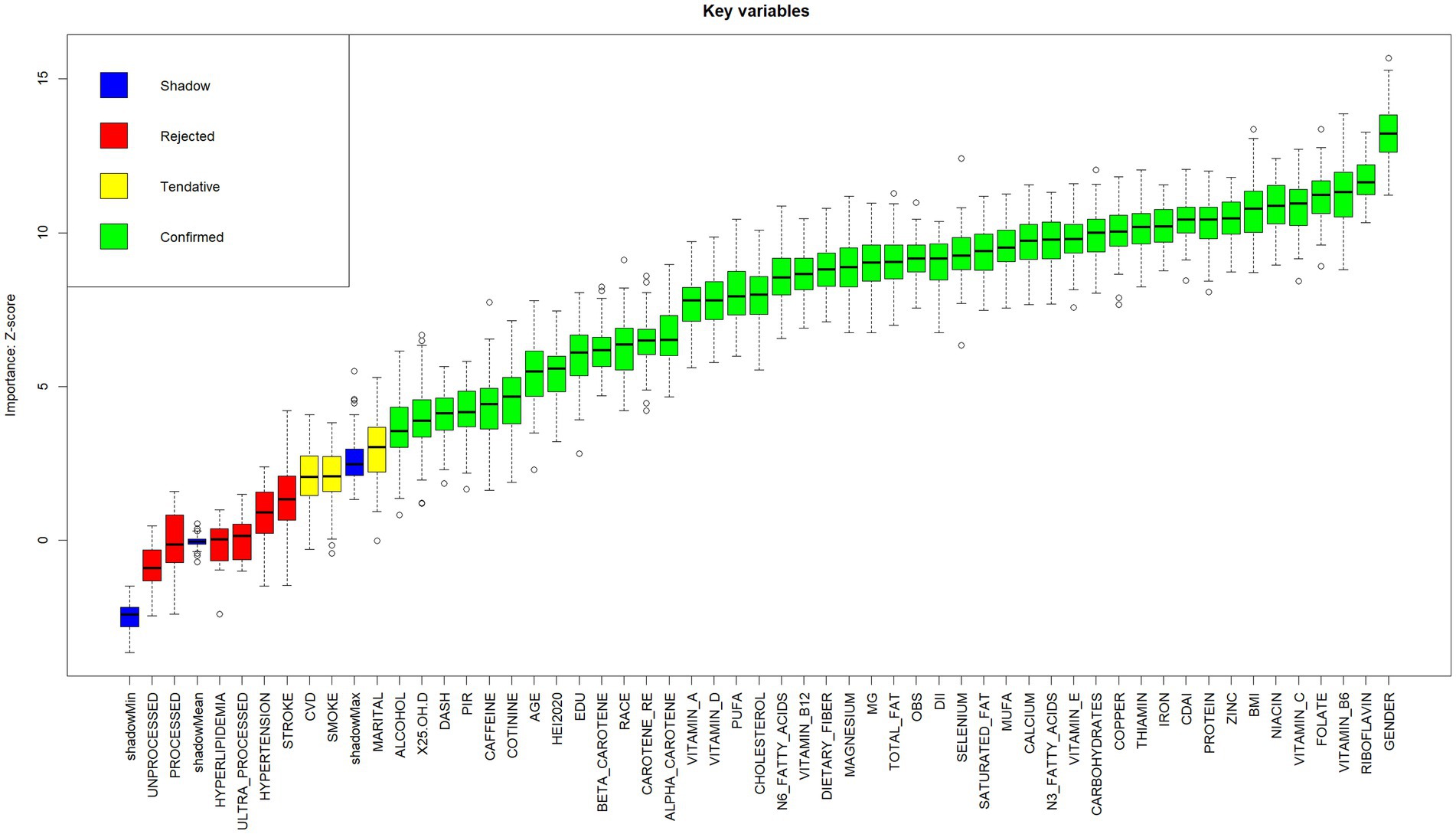 Prior to model construction, visual features were generated with categorical feature distributions presented in Supplementary Figure S2 and continuous feature distributions in Supplementary Figure S3. The Boruta algorithm was used to screen out collinearity based on correlation coefficients. As shown in Figure 2, nine variables (hyperlipidemia, hypertension, processed, stroke, ultra-processed, unprocessed, marital status, smoking status, and cardiovascular disease) were excluded, retaining 46 variables for model development.