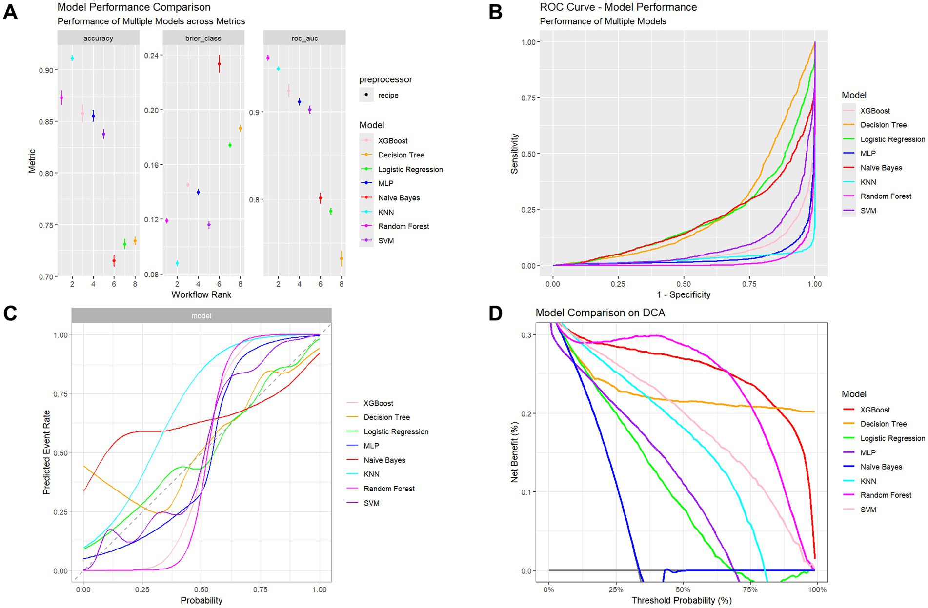 Figure 3. Performance assessment of multiple classifiers. (A) Comparison of accuracy, Brier score, and ROC-AUC among models. (B) ROC curves showing models’ discrimination performance. (C) Calibration curves illustrating agreement between predicted and observed outcomes. (D) Decision Curve Analysis (DCA) showing the net clinical benefit across probability thresholds.