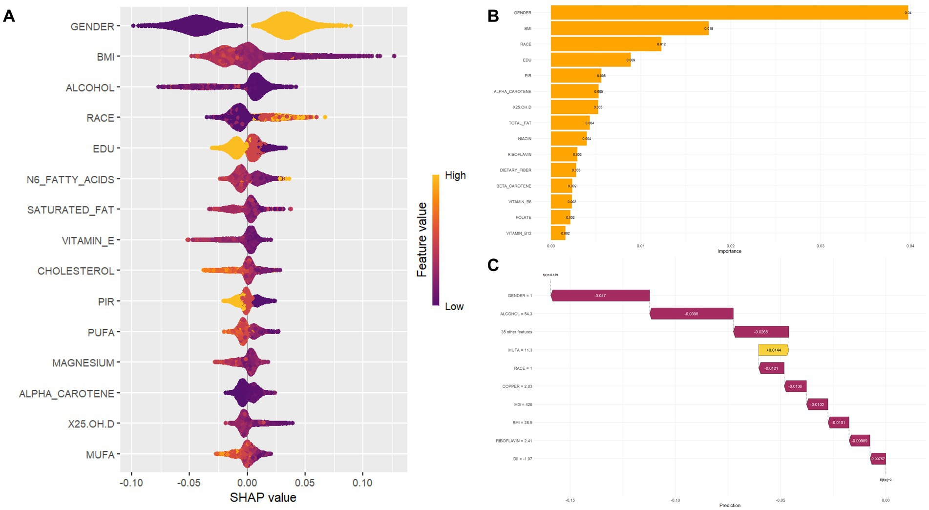 Our findings suggest that the RF model is the most effective choice for this prediction task. RF is an ensemble method that combines several decision trees, which enhances prediction accuracy through techniques like bootstrap aggregating and random feature selection (33). This model is particularly advantageous in healthcare settings due to its capability to manage various data types, its resistance to overfitting, and its inherent feature importance measures. Additionally, the model’s leaf-wise growth strategy and ensemble characteristics allow it to identify intricate relationships between dietary nutrient intake and comorbidity risk, all while remaining interpretable through SHAP analysis (34). The SHAP analysis indicated that gender, BMI, and certain dietary nutrition (carotenoids, vitamin E, magnesium, and zinc) were the most significant predictors. These results are consistent with the current literature regarding the pathophysiology linking DM and OP, as well as the protective effects of dietary nutrient intake.
