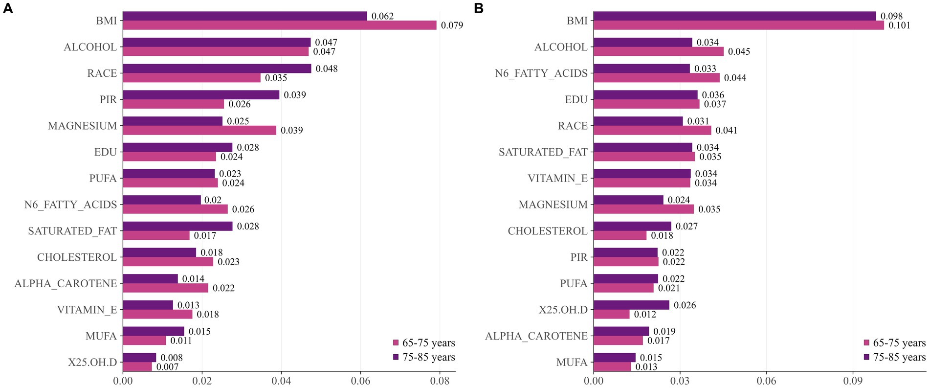 Additionally, we conducted an analysis of the “age × gender” interaction term. Figure 5 displays risk factors stratified by gender and age. Women exhibited consistent patterns: BMI was the primary risk factor across all age groups. Men, however, exhibit a differentiated pattern: BMI becomes more prominent among those aged 65–75, while alcohol intake and racial factors exert greater influence in the 75–85 age group. Notably, n-6 fatty acids and educational attainment show greater significance among younger women. Magnesium and vitamin E consistently maintain significant protective effects across all subgroups.