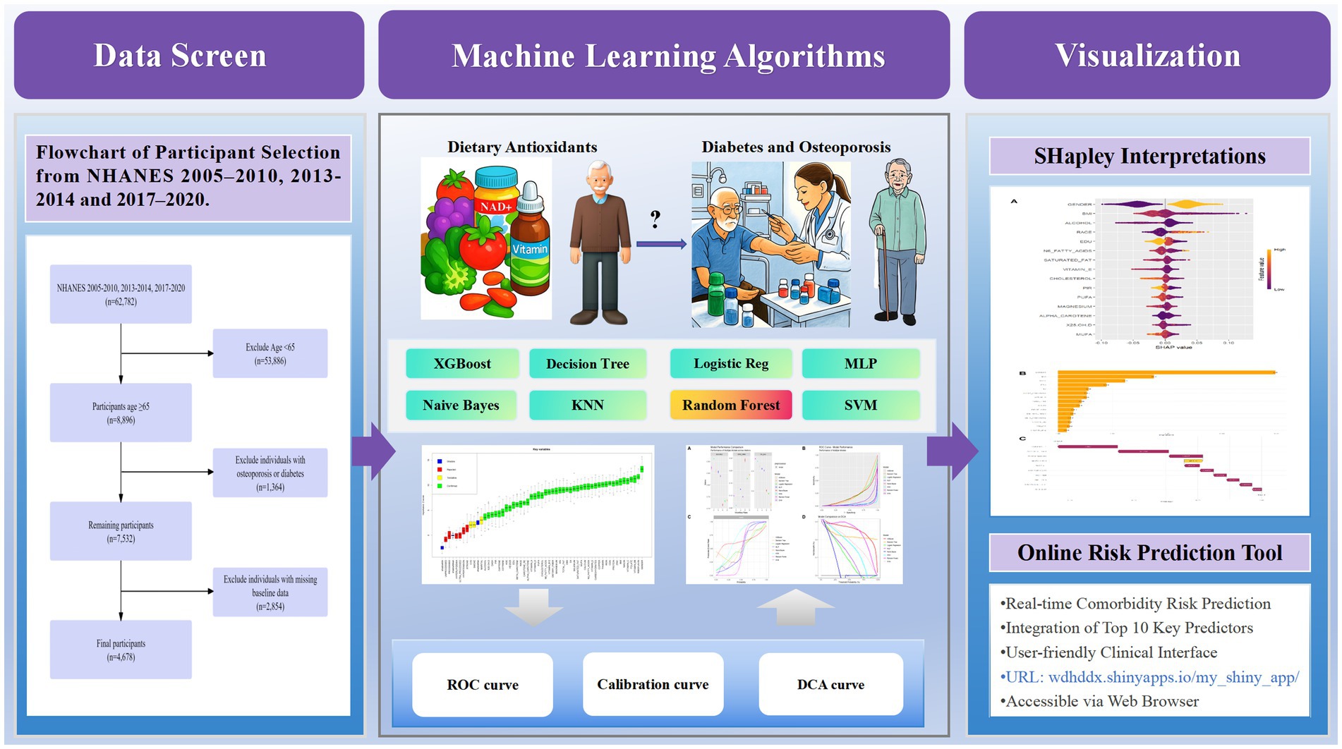 In this context, machine learning algorithms have emerged as powerful tools for disease prediction, capable of analyzing complex, multidimensional data to create effective predictive models (18, 19). This study uses data from the National Health and Nutrition Examination Survey (NHANES) database, employing eight machine learning algorithms and SHAP analysis. The goal is to investigate the predictive role of dietary antioxidants for the comorbidity of prediabetes or diabetes with osteoporosis in older adults, identify key contributing factors, and develop an online prediction tool to provide a scientific basis and practical tool for early detection and intervention.