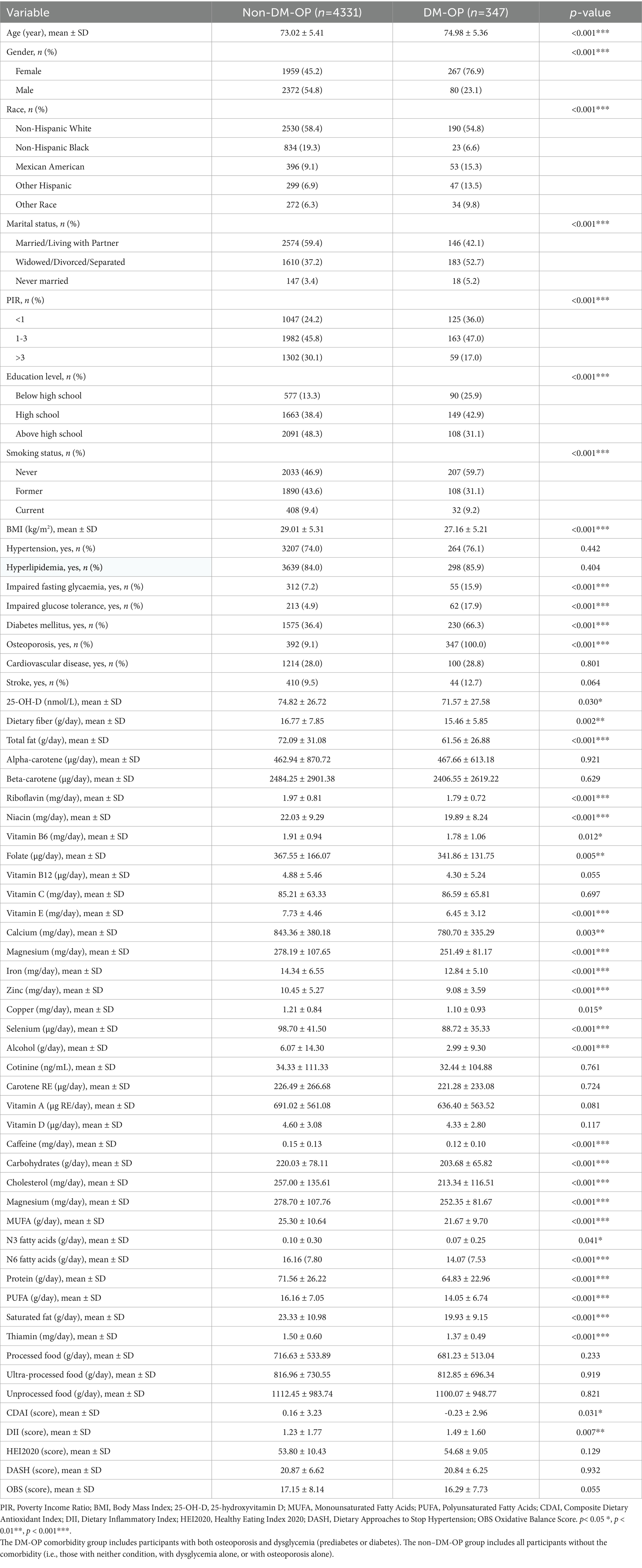 A total of 4,678 participants were included in the analysis: 4,331 (92.6%) in the non-DM-OP (i.e., participants without the coexistence) group and 347 (7.4%) in the DM-OP comorbidity group. The DM-OP group was significantly older and predominantly female (p < 0.001). They exhibited lower socioeconomic status, with higher poverty rates and lower educational attainment (p < 0.001). Although the DM-OP group had a lower body mass index (BMI), they showed a higher prevalence of diabetes mellitus (p < 0.001) and impaired glucose metabolism. Their dietary intake included significantly less total fat, protein, and multiple micronutrients, with lower CDAI scores (p = 0.031) and higher DII scores (p = 0.007), as shown in Table 1.