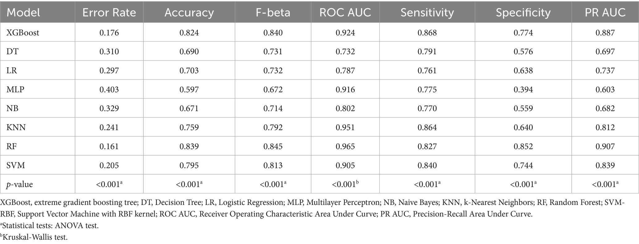 Eight machine learning algorithms were implemented using the mlr3 framework: XGBoost, decision tree, logistic regression (LR), multilayer perceptron (MLP), naive Bayes, k-nearest neighbors (KNN), RF, and support vector machine with radial basis function (SVM-RBF). These algorithms were selected for their complementary strengths and proven effectiveness in medical prediction tasks (21–23). Model performance was assessed using classification error rate, accuracy, F-beta score, area under the ROC curve (AUC), sensitivity, specificity, and area under the precision-recall curve (AUPRC). Ten-fold cross-validation ensured robust performance estimation. Statistical significance of performance differences between models was evaluated using analysis of variance (ANOVA) and the Kruskal-Wallis H test. Feature importance in the optimal model was quantified using SHAP (SHapley Additive exPlanations) values, which provide global feature rankings and local explanations for individual predictions based on game theory. All analyses were conducted in R (version 4.4.3) using the packages survey, DMwR, ggcor, mlr3, mlr3benchmark, mlr3extralearner, kernelshap, and shapviz. Statistical significance was set at p < 0.05 for all tests.