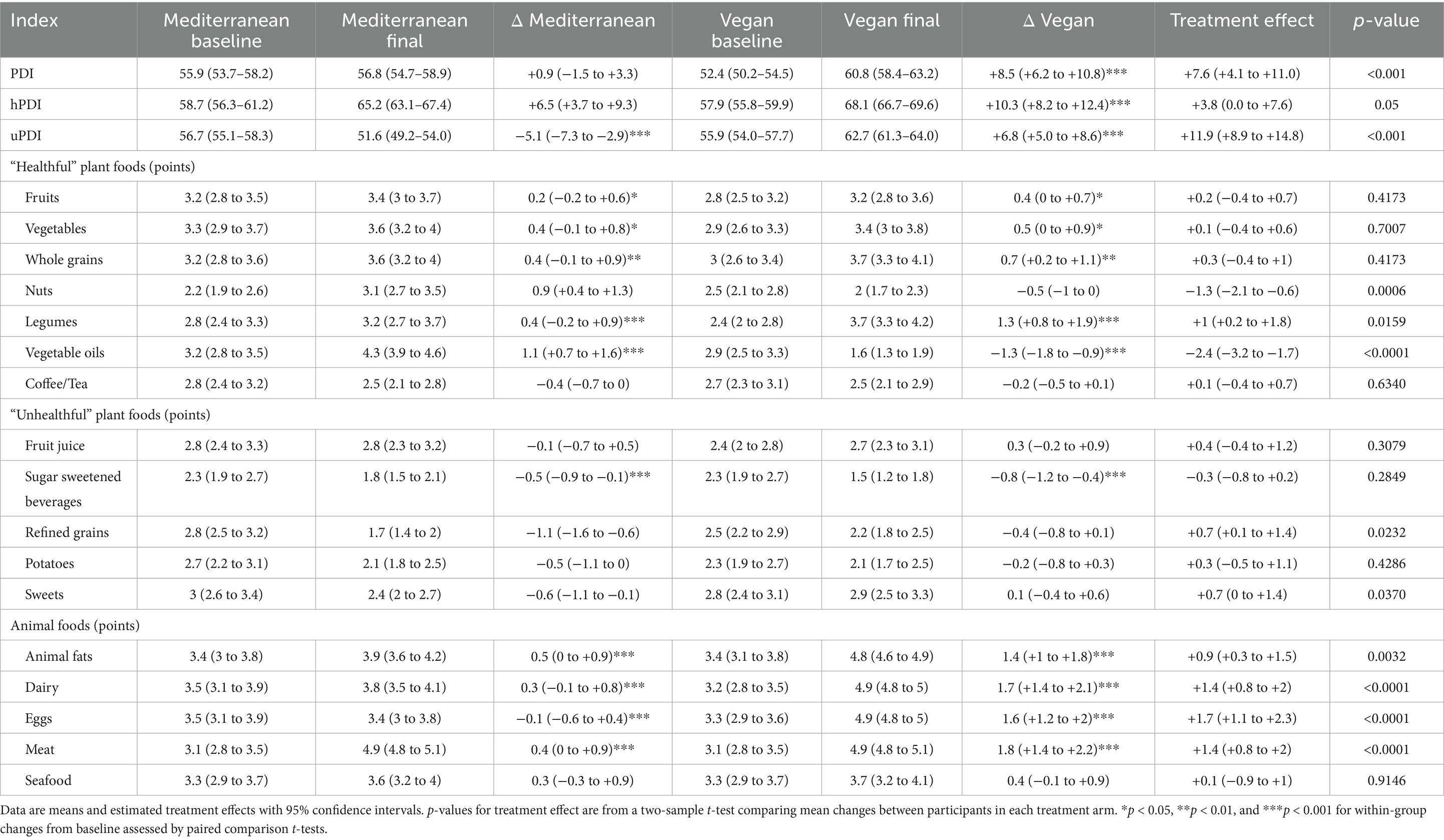 Table 1. Changes in PDI, hPDI, and uPDI and their food components during the study comparing a Mediterranean and low-fat vegan diet.