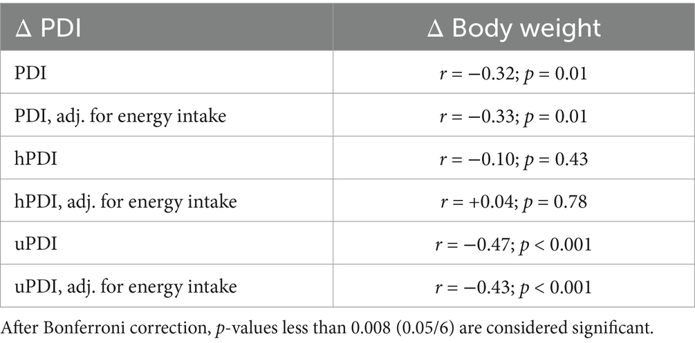 Table 2. Spearman correlations between changes in body weight and changes in PDI, hPDI, and uPDI in the first 16 weeks of the study, across the study diets.