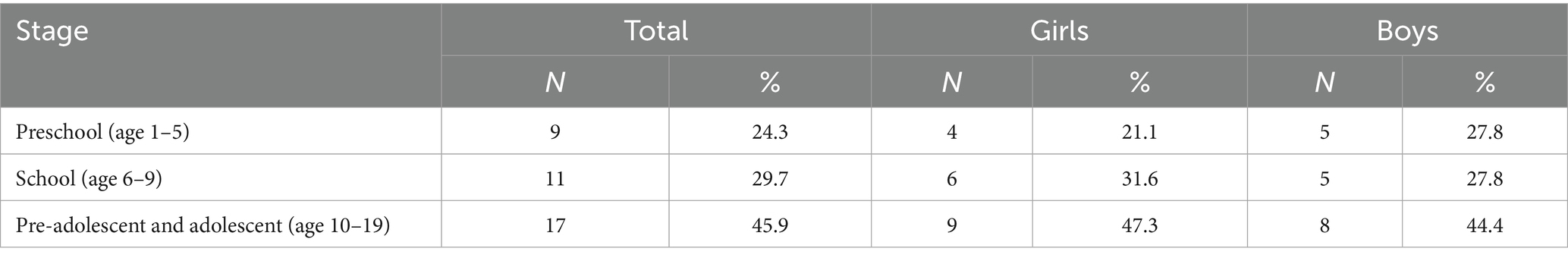 The study sample was stratified by developmental stage (Table 1). The preschool stage (1–5 years) included 9 patients, representing 24.3% of the total sample. The school-age group (6–9 years) comprised 11 patients, accounting for 29.7% of the total. The pre-adolescent and adolescent stage (10–19 years) consisted of 17 patients, representing 45.9% of the sample.