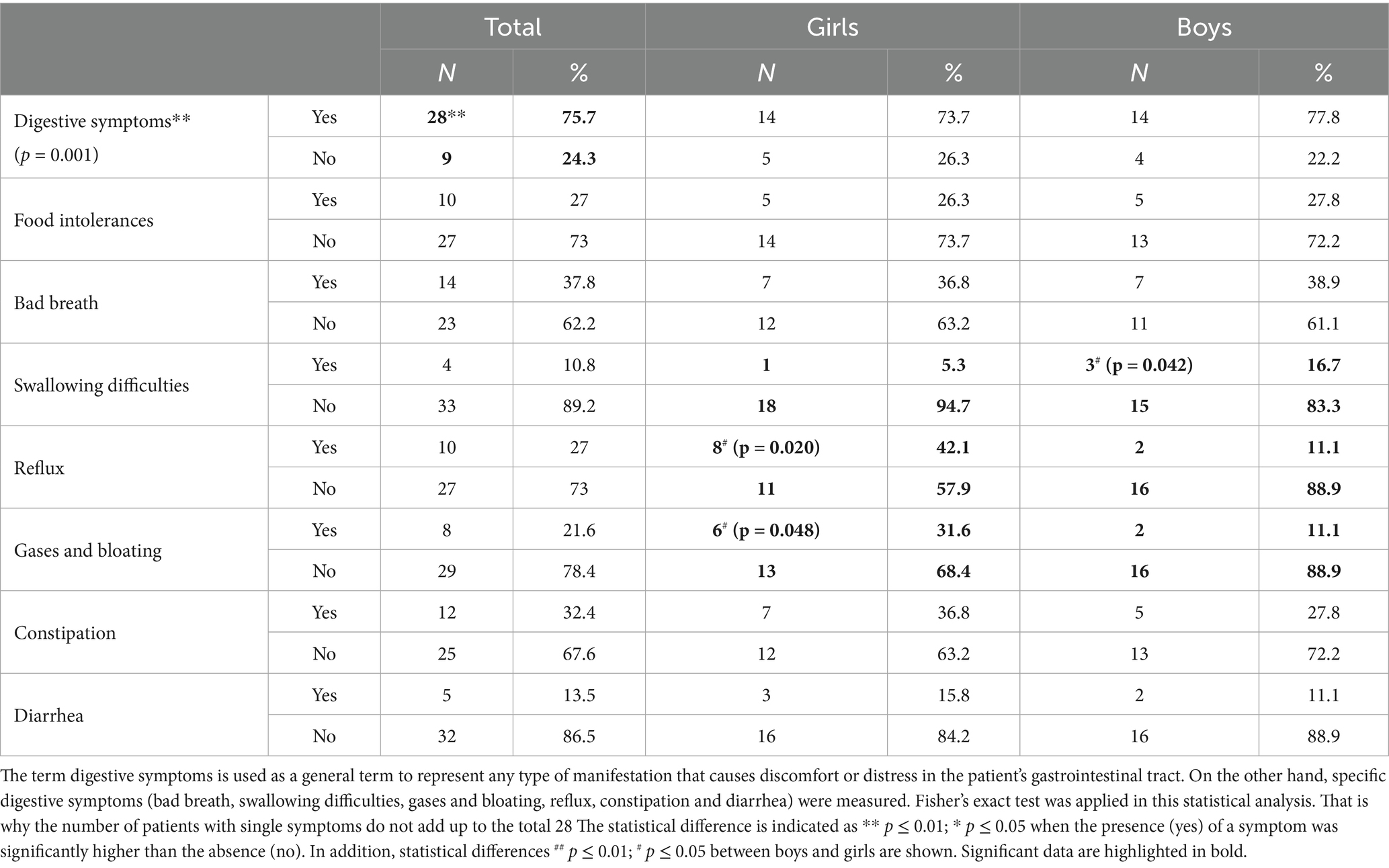 The analysis of digestive symptoms (Table 2) revealed that the number of patients presenting such symptoms was significantly higher (p = 0.001) than those who did not report any digestive-related issues (Table 2). Specifically, a total of 28 patients (75.7%) reported discomfort affecting the digestive system, compared to 9 patients (24.4%) who did not. Among those who experienced symptoms, there were 14 girls (73.7%) and 14 boys (77.8%).