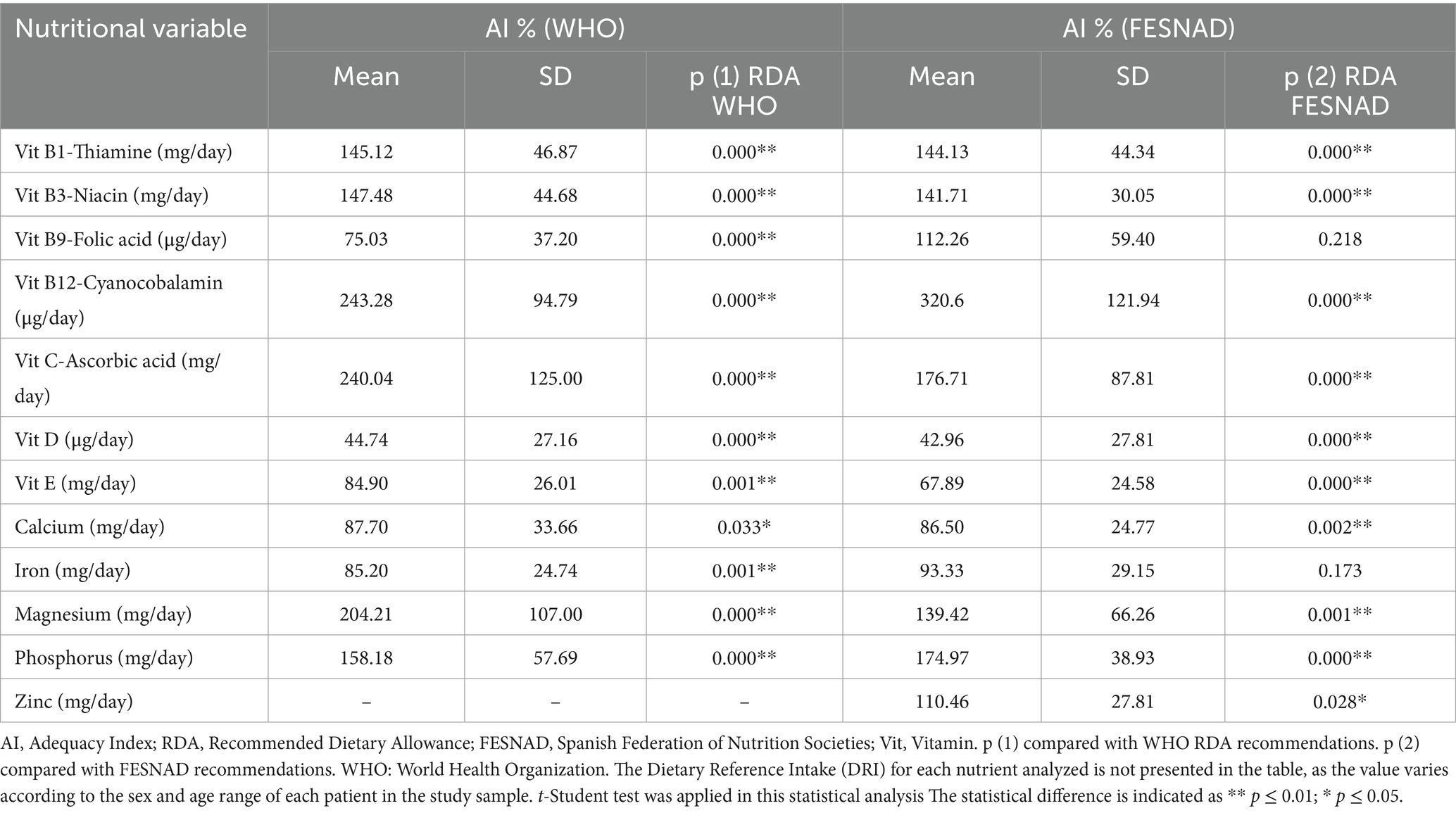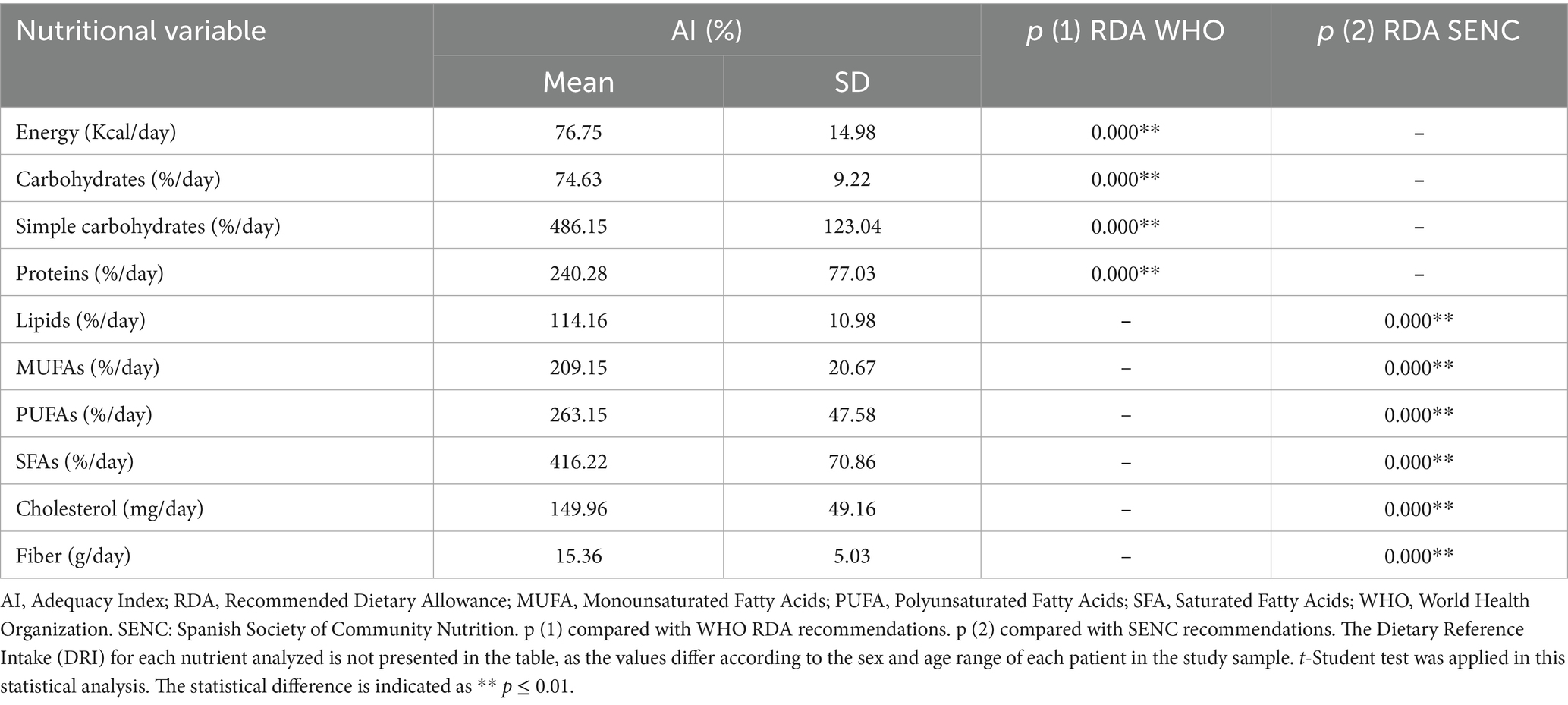 Additionally, to assess whether the diet was adequate or not, the nutritional guidelines from the Sociedad Española de Nutrición Comunitaria (SENC) and Federación Española de Sociedades de Nutrición, Alimentación y Dietética (FESNAD) at the national level (26, 27), as well as the recommendations established by the World Health Organization (WHO), were used as references. The nutritional adequacy index (AI) was calculated as the ratio between the observed intake of a nutrient and the recommended intake, expressing the result as a percentage. AI is an indicator that measures whether the intake of a specific nutrient meets the dietary recommendations established for a given population. Values above 100% would indicate an excess intake of that nutrient, while values below 100% would indicate a deficiency.