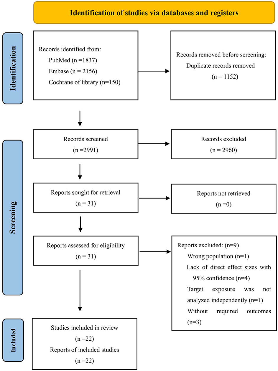Our search strategy identified 4,143 articles. After removing 1,152 duplicates, 2,991 abstracts were reviewed in detail. Of these, 2,960 were excluded based on title and abstract screening. Among the remaining 31 studies, nine were further excluded for the following reasons: one study reported an incorrect population, four lacked effect values or CIs, one did not analyze the target exposure independently, and three did not meet the eligibility criteria. Ultimately, 22 studies were included in the systematic review (22–43). A flowchart of the selection process is shown in Figure 1. Excluded studies and their reasons are listed in Supplementary Table S4.