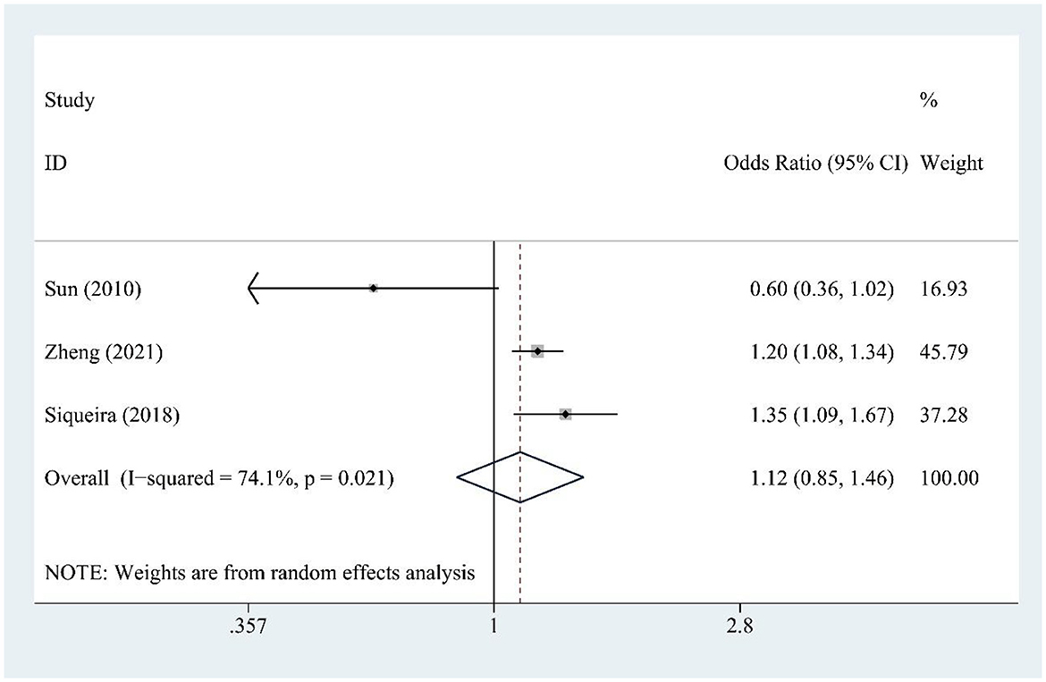Fructose consumption (three studies) was not significantly associated with hyperuricemia risk [OR = 1.12, 95% CI (0.93, 1.85), I2 = 74.1%, P = 0.021] (Figure 4). Moderate heterogeneity indicates some variability. Sensitivity testing showed no substantial changes in the findings (Supplementary Figure S2).