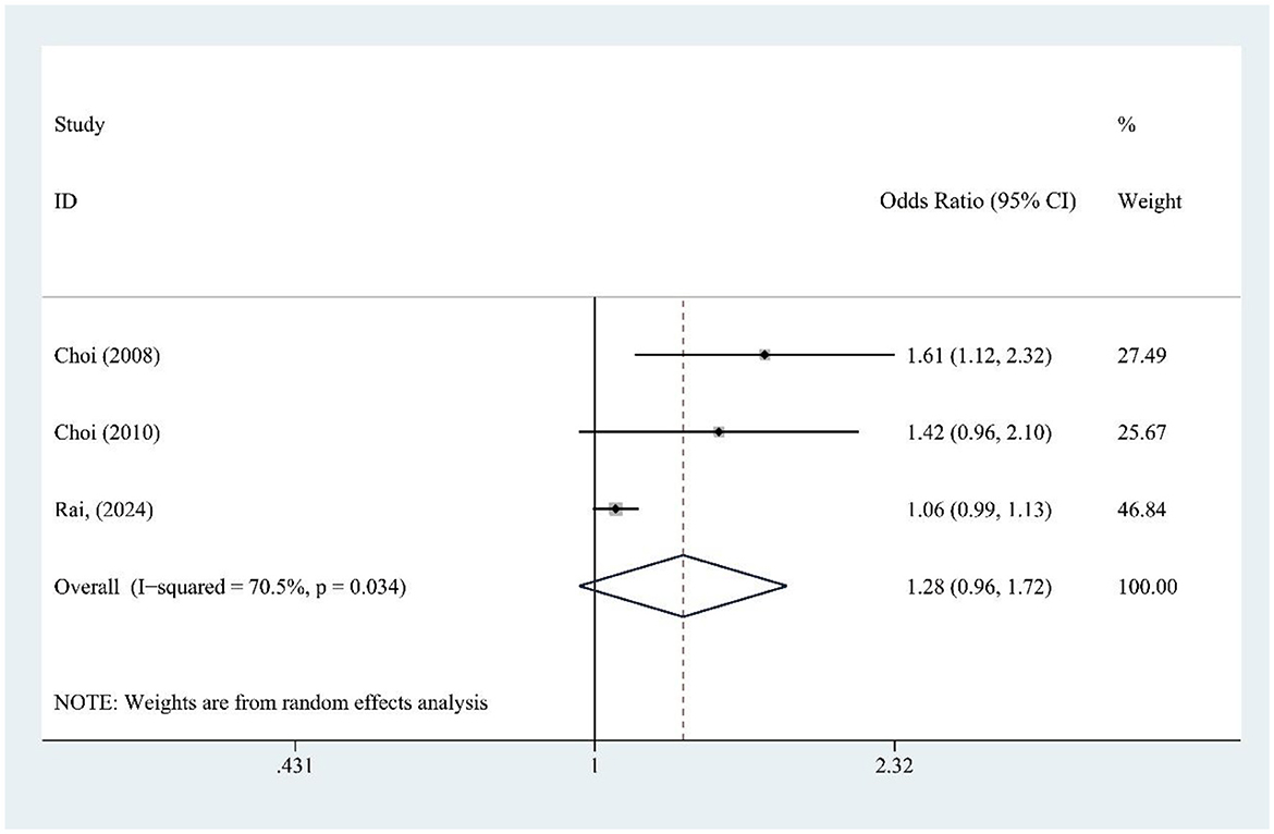 FJ intake (three studies) was not significantly associated with gout risk [OR = 1.28, 95% CI (0.96, 1.72), I2 = 70.5%, P = 0.034] (Figure 6), though high heterogeneity suggests variability among studies. Sensitivity analysis confirms result stability (Supplementary Figure S3).