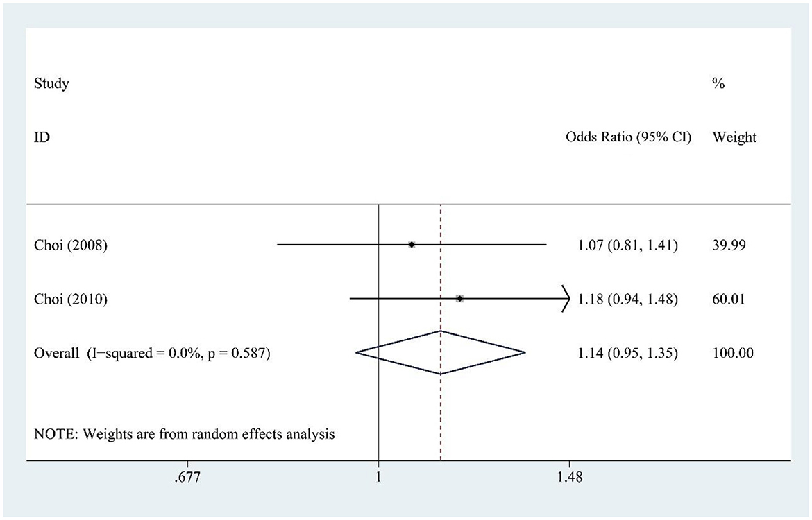 For FJ, no significant association with hyperuricemia risk was found in either females (three studies) [OR = 1.13, 95% CI (0.95, 1.35), I2 = 13.4%, P = 0.315] or males (three studies) [OR = 1.15, 95% CI (0.97, 1.38), I2 = 0.0%, P = 0.721] (Table 2).