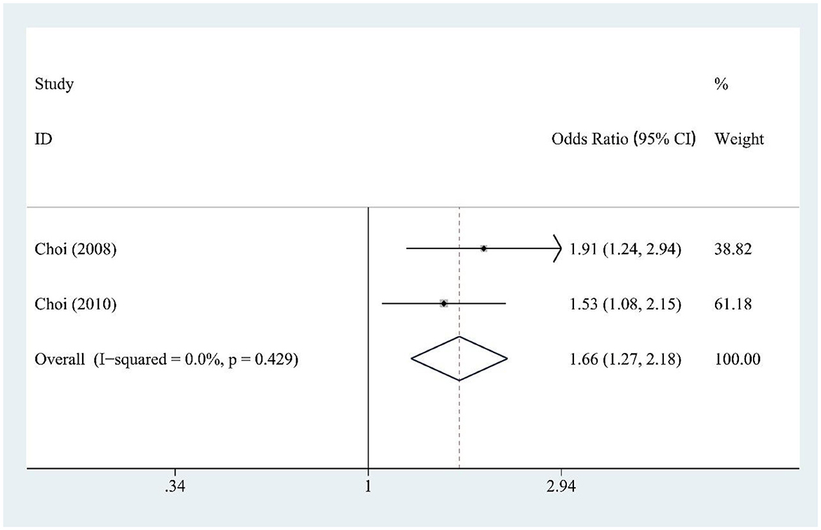 Fructose intake (two studies) was significantly associated with increased gout risk [OR = 1.66, 95% CI (1.27, 2.18), I2 = 0.0%, P = 0.429] (Figure 8), showing a strong and consistent effect across studies.