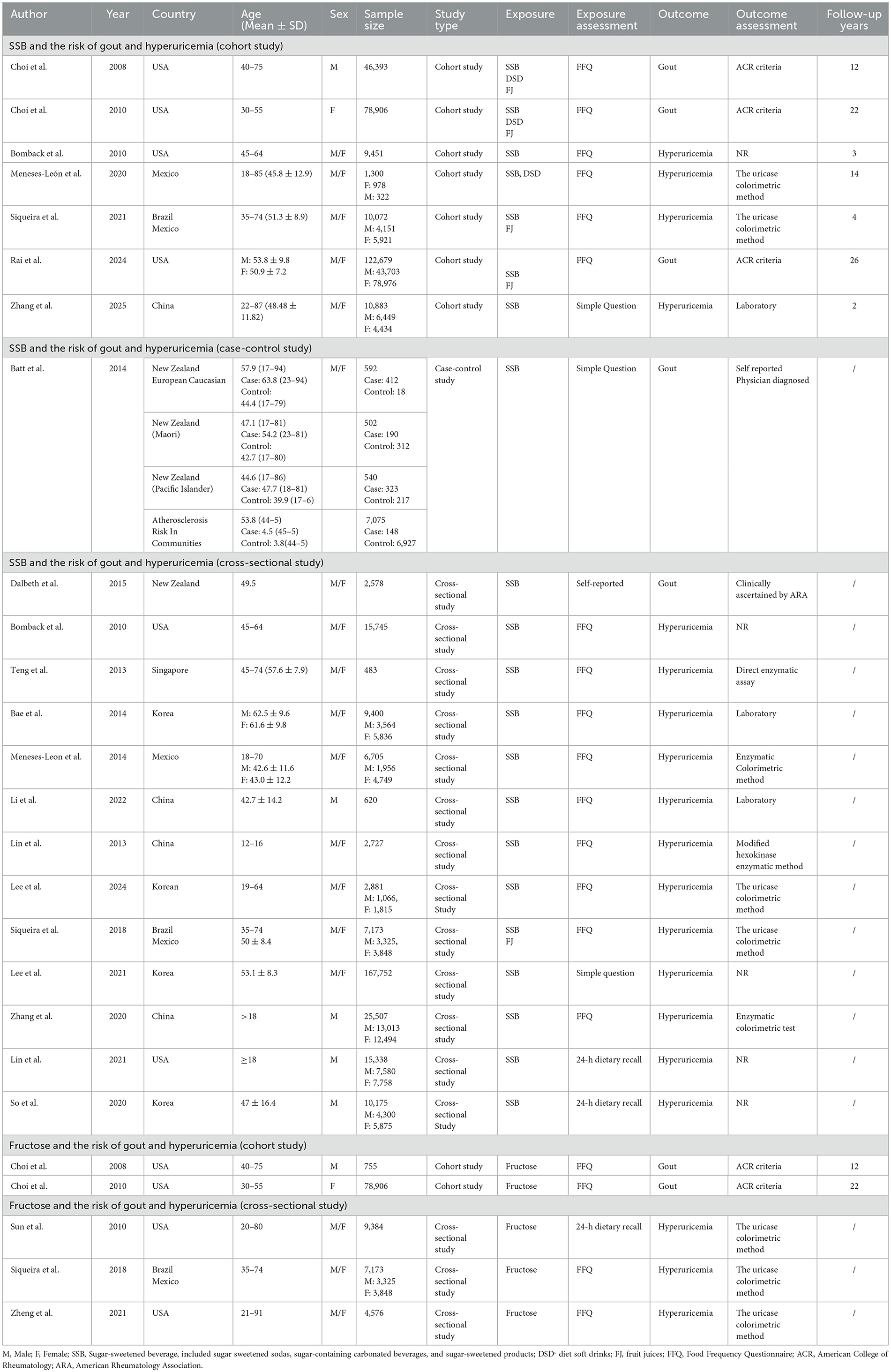 SSB consumption is increasingly recognized to increase the risk of gout and hyperuricemia. A meta-analysis of prospective studies noted an adverse association between SSB and juice intake and incident gout. However, the scope of the analysis was limited to a smaller number of studies (16). Another meta-analysis established a significant positive association between SSB intake and the risk of gout and hyperuricemia, though its inclusion of literature remains constrained (17). To address these limitations, we therefore performed the updated meta-analysis additional study with a new collection of 11 newly published studies after 2017, aimed to overcomes the challenges of small study inclusion, thereby enhancing the reliability and comprehensiveness of the findings, and to fill the gap in quantitative evidence regarding the impact of SSBs and dietary fructose as modifiable risk factors for hyperuricemia and gout.