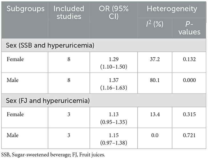 Among females (eight studies), SSB intake was significantly associated with higher hyperuricemia risk [OR = 1.29, 95% CI (1.10, 1.50), I2 = 37.2%, P = 0.132] (Table 2). Males (eight studies) showed a stronger association [OR = 1.37, 95% CI (1.16, 1.63), I2 = 80.1%, P = 0.000] (Table 2).