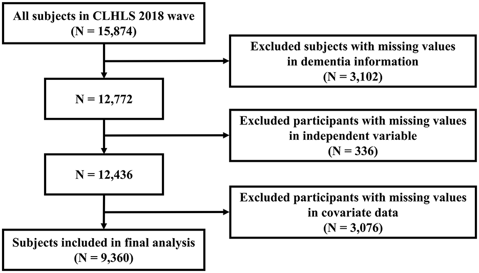 We employed cross-sectional data from the 2018 wave of the CLHLS, comprising an initial cohort of 15,874 participants. After excluding 3,102 individuals with missing dementia-related data and subsequently removing cases with incomplete independent variable or covariate information, the ultimate analytical cohort included 9,360 individuals. A comprehensive depiction of the data preparation methodology is presented in Figure 1.