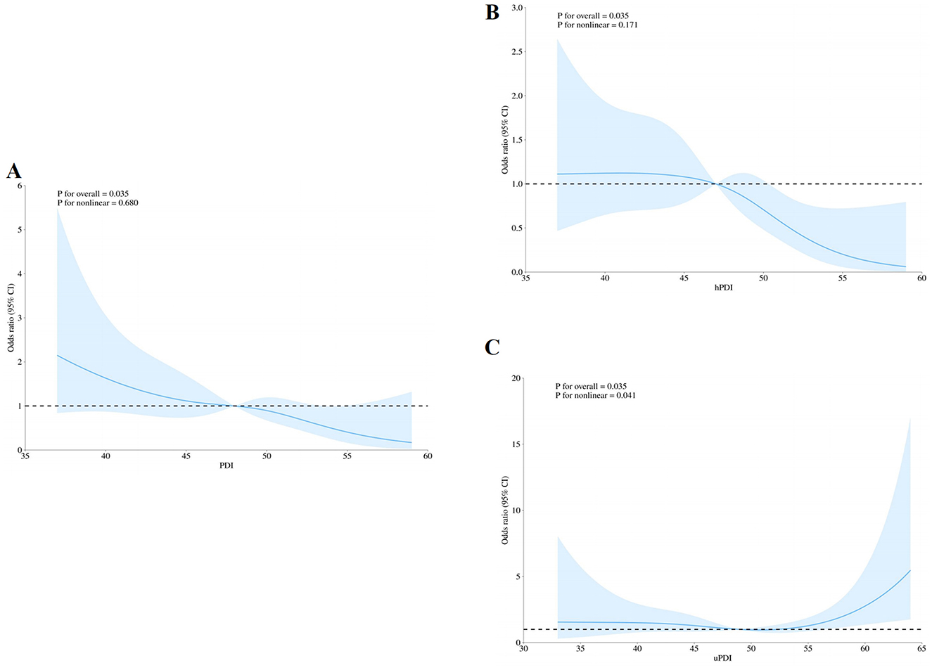 Figure 2. Restricted cubic spline (RCS) analysis for the associations of plant-based diet indices with dementia in the CLHLS main cohort (N = 9,360). (A) Overall Plant-based Diet Index (PDI); (B) Healthy Plant-based Diet Index (hPDI); (C) Unhealthy Plant-based Diet Index (uPDI). Curves and shaded areas represent the odds ratio (OR) and 95% confidence interval (CI), respectively. All analyses were fully adjusted according to Model 3. P for overall indicates the P-value for the overall association, and P for nonlinear tests the nonlinear relationship.