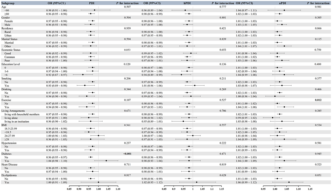 Figure 3. Subgroup and interaction analyses for the associations of Plant-based Diet Indices (PDI, hPDI, and uPDI) with dementia in the CLHLS main cohort (N = 9,360). Dots and horizontal lines represent the odds ratio (OR) and its 95% confidence interval (CI), respectively. All subgroup analyses were adjusted according to Model 3, controlling for all covariates except the stratifying variable. P for interaction indicates the statistical significance of the interaction between the subgroup variable and the diet indices.