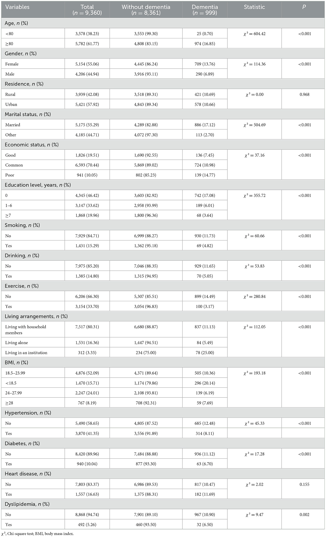 The analytical cohort consisted of 9,360 participants, among whom dementia prevalence was recorded in 999 cases (10.67%), while 8,361 individuals (89.33%) were non-demented, as detailed in Table 1. Among them, 55.06% were male and 44.94% were female. The majority of participants were aged 80 years or older (61.77%). The proportions of participants in the dementia and non-dementia groups differed significantly across various age, gender, marital status, economic status, education level, smoking status, drinking status, exercise habits, living arrangements, BMI, hypertension, diabetes, and dyslipidemia categories (P < 0.05).