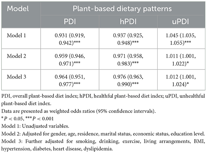 To evaluate the associations linking plant-derived eating habits with dementia prevalence, three logistic regression models were formulated. As shown in Table 2, in Model 1, which was unadjusted for any covariates, the scores of PDI, hPDI, and uPDI were significantly associated with dementia (PDI: OR = 0.931, 95% CI = 0.919–0.942; hPDI: OR = 0.937, 95% CI = 0.925–0.948; uPDI: OR = 1.045, 95% CI = 1.035–1.055). In Model 3, after further adjusting for all covariates, these associations remained statistically significant (PDI: OR = 0.964, 95% CI = 0.951–0.977; hPDI: OR = 0.976, 95% CI = 0.963–0.990; uPDI: OR = 1.012, 95% CI = 1.001–1.024). In Model 3, E-values were further calculated to assess the potential influence of unmeasured confounding. The E-values (PDI: 1.55; hPDI: 1.26; uPDI: 1.88) indicated that the influence of unmeasured confounding factors on the association between plant-based diet indices and dementia was small. Overall, from Model 1 to Model 3, the magnitude of these associations decreased slightly as additional covariates were included.
