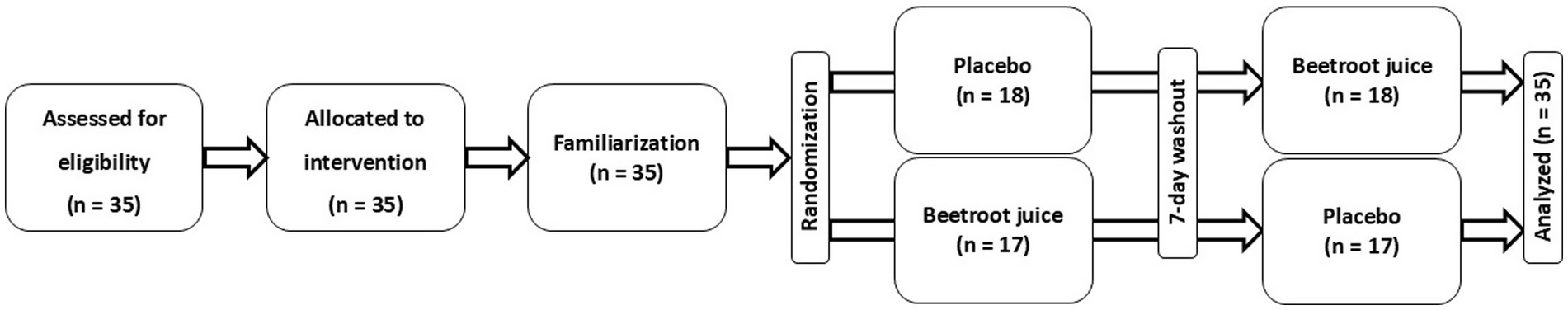 All 35 participants completed the study without any dropouts or adverse events and were included in statistical analyses. Participants’ guesses regarding supplement allocation in the two experimental sessions were distributed as follows. In the BRJ trial, young athletes correctly identified the supplement in 27% of cases, incorrectly in 32%, and reported uncertainty in 41%. During the placebo trial, participants guessed correctly 35.3% of the time, incorrectly 29%, and were unsure 35.7%.