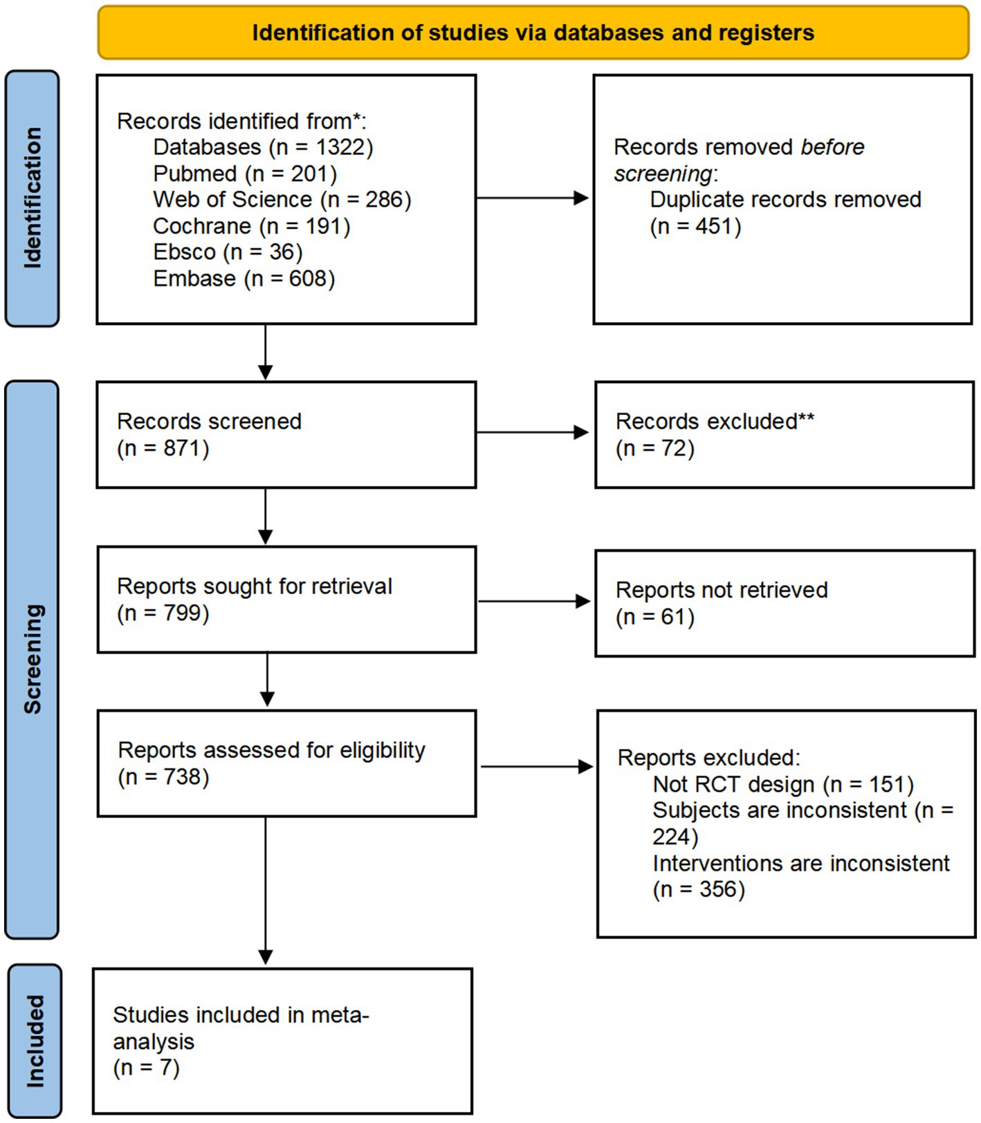 A total of 1,322 articles were retrieved: 201 from the PubMed database, 286 from the Web of Science database, 191 from the Cochrane database, 36 from the Ebsco database, and 608 from the Embase database. After screening titles, abstracts, and full texts, 1,315 articles were excluded. Ultimately, 7 studies met the inclusion criteria and were considered suitable for exploratory meta-analysis. These studies were used to investigate potential trends in the effects of CRDs on CGM-derived 24-h MBG levels in individuals with T2DM. The selection process was shown in the Figure 1.