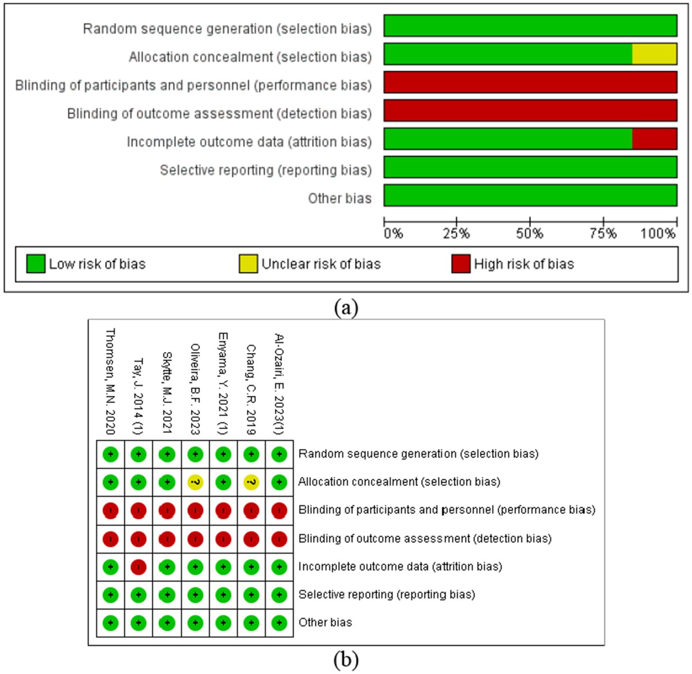 Figure 2. Risk of bias assessment of the included studies: (a) risk of bias graph; (b) risk of bias summary plot.