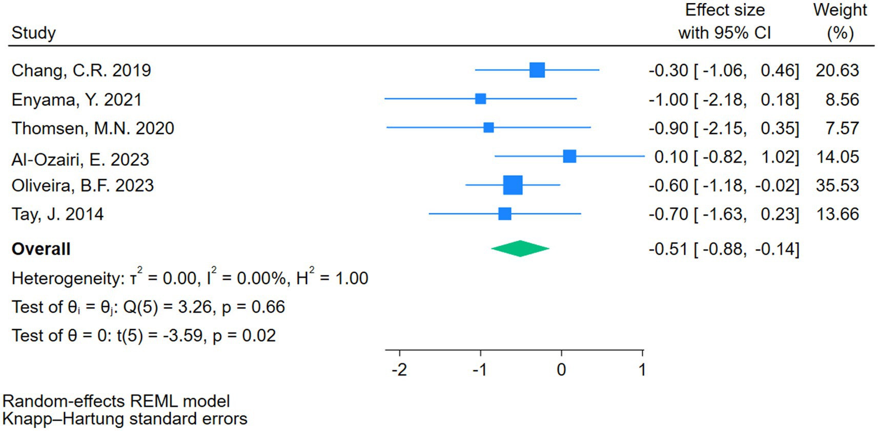 A total of seven RCTs involving 329 participants reported outcomes on 24-h MBG levels, with 162 patients in the intervention group and 167 in the control group (see Supplementary Figure 1). One study (13) reported incomplete CGM recordings, which contributed substantially to heterogeneity and may have biased the estimated 24-h MBG. After removing this study, heterogeneity decreased to I2 = 0% (p = 0.66) (see Figure 3). Given the small number of remaining studies, a random-effects model using REML was applied, and 95% confidence intervals were adjusted with the Hartung-Knapp method. The results indicated that CRDs significantly improved 24-h MBG levels in patients with T2DM (d = −0.51, 95% CI: −0.88 to −0.14, p < 0.05).