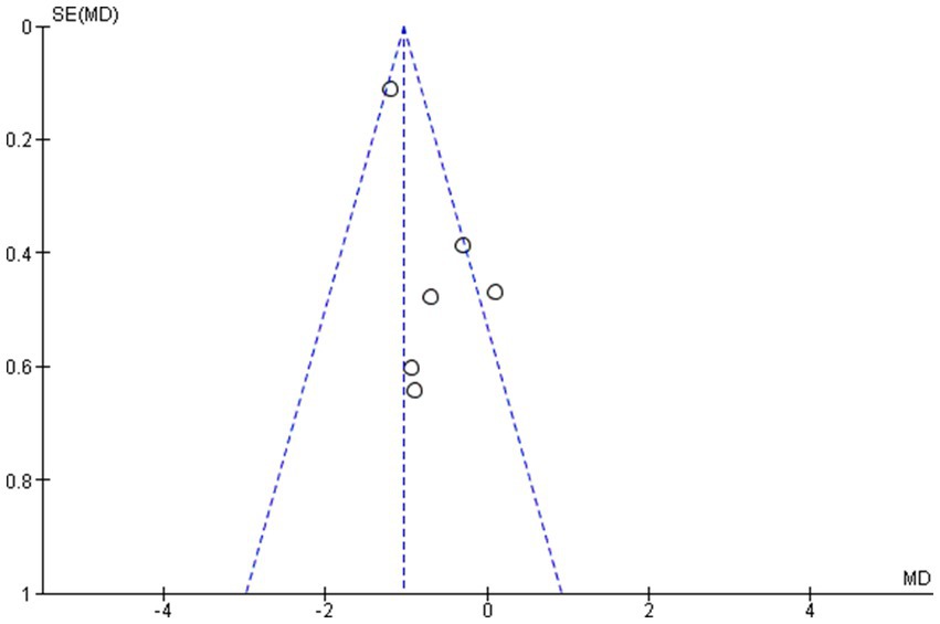 The outcome indicators of the included studies and the symmetrical distribution of scatter points on both sides of the funnel plot suggest that there is no publication bias. The publication bias analysis was performed based on the final set of studies after excluding one study with substantial heterogeneity (13). This exclusion was made to ensure a more accurate evaluation by minimizing the influence of potential outliers on the assessment of publication bias (see Figure 4).