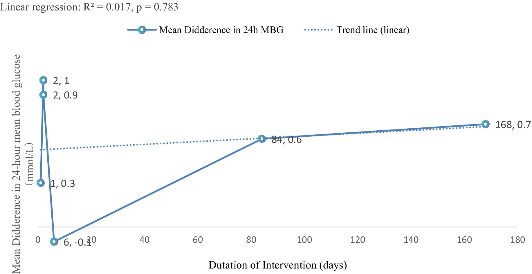 Figure 5. Trend analysis of intervention duration and 24-h MBG change. This exploratory trend analysis is limited by the small number of studies and should be interpreted cautiously.