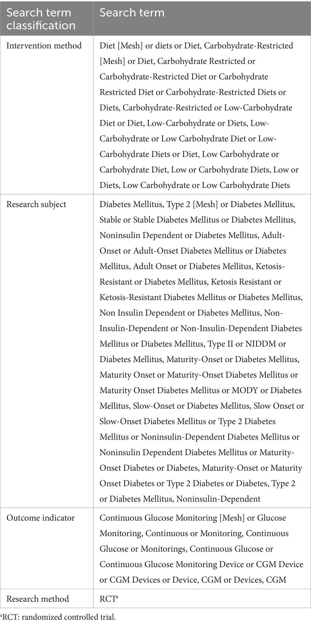 Eligible participants were adults aged 18 years or older diagnosed with T2DM. Studies were included if they implemented a structured carbohydrate-restricted dietary intervention, with low-carbohydrate diets (LCDs) defined as ≤45% of total energy from carbohydrates and very-low-carbohydrate diets defined as <26% of total energy from carbohydrates, in accordance with the American Diabetes Association consensus statement (18, 19).