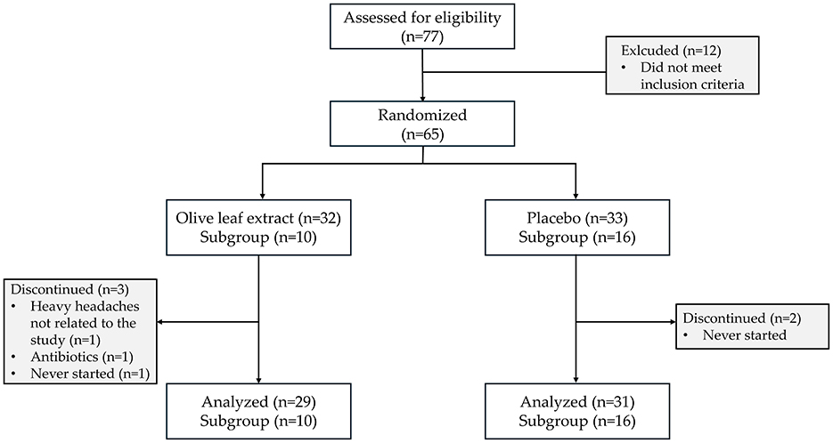 In total, 77 participants were screened for eligibility, of which 65 were included in the current study. Three participants allocated to the OLE group discontinued the study, one after the baseline measurements due to health reasons not related to the study (severe headaches), another after 6 weeks because of antibiotic intake, and one did not start the intervention after randomization. In the placebo group, two participants who were allocated never started the study after randomization. In the subgroup for the evaluation of skin quality with the C-Cube video-dermoscope, 26 participants were included; 10 were randomized into the OLE group and 16 to the placebo group (Figure 1).