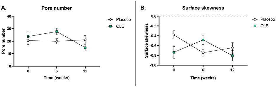 Figure 2. Pore number (A) and surface skewness (B) at baseline, after 6 and 12 weeks of placebo vs. OLE supplementation in postmenopausal women assessed with a C-Cube video dermoscope (n = 26). Surface skewness represents the degree of symmetry of the surface heights about the mean plane. Analyses were performed with an intention-to-treat linear mixed model using time and treatment as a fixed factor, baseline values as covariates, and participant as random factors with random intercepts. Post-hoc estimated marginal means were analyzed and pairwise comparisons were made. OLE, Olive leaf extract. Raw data are shown as mean ± SEM.