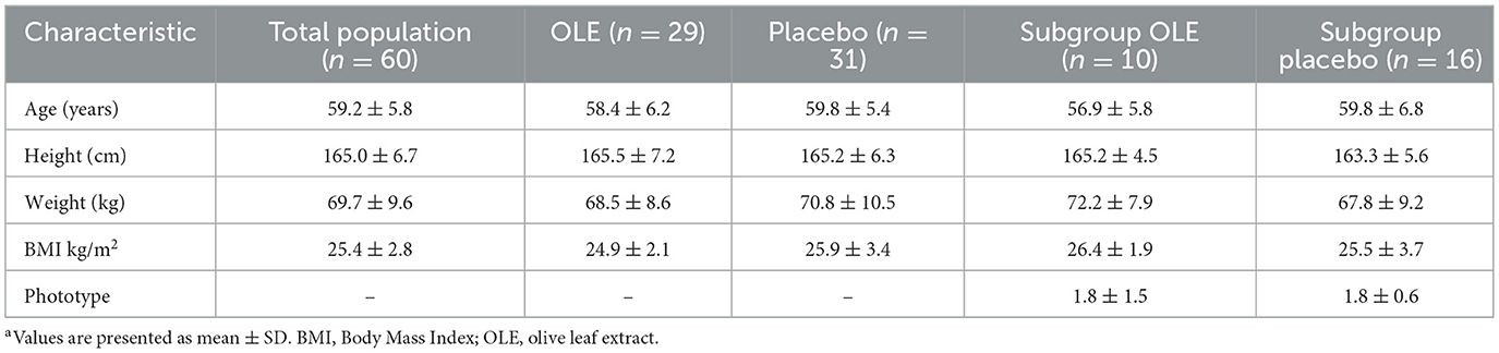 While the bioavailability and pharmacokinetics of the active compounds in OLE were not assessed in the present study, previous research using the same OLE demonstrated rapid absorption and systemic distribution of OLE-derived metabolites. García-Villalba et al. showed that after ingestion of 250 mg Bonolive®, metabolites such as hydroxytyrosol glucuronide, hydroxytyrosol sulfate, and oleuropein aglycone glucuronide appeared in the plasma of postmenopausal women within 30–75 min, with peak concentrations reached within the first hour. Importantly, postmenopausal women exhibited higher plasma concentrations of several OLE metabolites compared to premenopausal women, indicating that hormonal status may influence OLE bioavailability (53). These findings support the plausibility of systemic effects of OLE supplementation and provide a pharmacokinetic basis for interpreting the outcomes of the current study. While tissue-specific distribution (e.g., accumulation in skin) remains to be elucidated, the existing data confirm that the administered dose results in measurable systemic exposure.