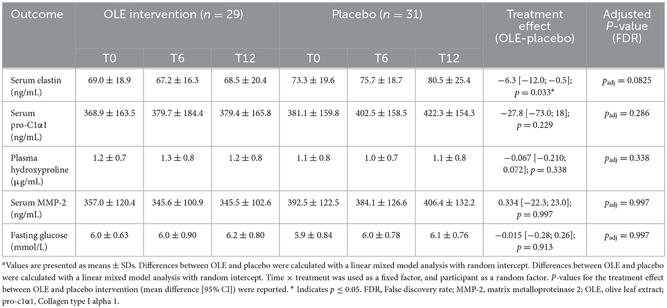 Although the stabilization of elastin did not remain statistically significant after correction for multiple testing, this trend may point to a stabilization of elastin breakdown. Elastin is a key structural protein present in many tissues, including connective tissue, muscles, blood vessels, lungs, and skin. Its degradation is a natural part of aging and occurs slowly, with a half-life of approximately 70 years (30). Given this long turnover rate, short-term interventions may not lead to significant decreases in circulating elastin levels, even if degradation processes are affected. Since elastin levels in the current study were measured in blood, it remains uncertain which specific tissue(s) contributed to the observed changes. Nevertheless, increased elastin degradation in any tissue may affect systemic function by compromising the elasticity and function of vital organs, such as the skin, heart, and lungs, potentially contributing to cardiovascular or pulmonary diseases (31, 32). Hence, OLE may contribute to the preservation of tissue integrity by inhibiting or slowing down elastin degradation, which in turn could help maintain the structural and functional properties of tissues and organs such as connective tissue, muscles, and the skin. While the observed trend in elastin stabilization in the OLE group is not statistically significant, it may still reflect subtle biological effects that warrant further investigation in longer-term and tissue-specific studies. To our knowledge, no clinical evidence on the effect of olive polyphenols on elastin levels is currently available. However, ex vivo stimulation of isolated aortic segments from Fbn1C1039G+/− mice, a model of elastin fragmentation, with hydroxytyrosol did not affect elastin content (33). In contrast, in a 3D full-thickness pigmented skin model, exposed to UV radiation, a mixture of olive (0.001%), pomegranate (0.01%), and osmanthus (0.01%) extracts repaired the elastin decrease induced by UV exposure (34). These findings suggest that while hydroxytyrosol alone may not affect elastin in vascular tissue, combinations of polyphenols may exert protective effects in skin models. Thus, the potential of OLE to preserve tissue integrity by slowing elastin degradation warrants further investigation, particularly in clinical tissue-specific contexts such as the skin.
