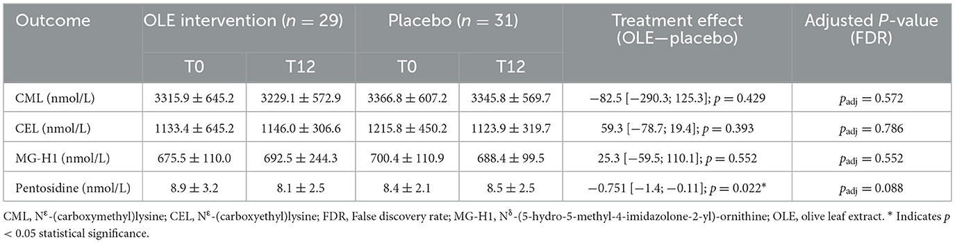 Of the AGEs measured, a reduction in plasma pentosidine was observed in the OLE group compared to placebo, but this effect also lost significance after correction for multiple testing. AGEs are formed through non-enzymatic reactions between sugars and proteins, lipids, or nucleic acids, leading to stable and often irreversible molecular changes. Pentosidine levels are elevated in patients with metabolic syndrome compared to healthy individuals (41). A reduction in pentosidine levels has been shown to be associated with improved metabolic control and a lower risk of microvascular complications, hypertension, and hyperlipidemia (41–43). Thus, reduced pentosidine may reflect improved metabolic control. Although fasting glucose levels remained unaffected, triglyceride levels were significantly reduced in the OLE group compared to control, as reported in our previous article based on the same study population (26). In the skin, AGEs accumulate over time and are known to impair skin structure and function by promoting collagen cross-linking, reducing elasticity, and increasing oxidative stress and inflammation (44). Preclinical findings show that OLE can inhibit the formation of AGEs such as pentosidine in food models (45). However, given the lack of clinical evidence on glycation modulation by olive polyphenols, further mechanistic studies are needed to confirm whether OLE can influence glycation pathways in vivo.