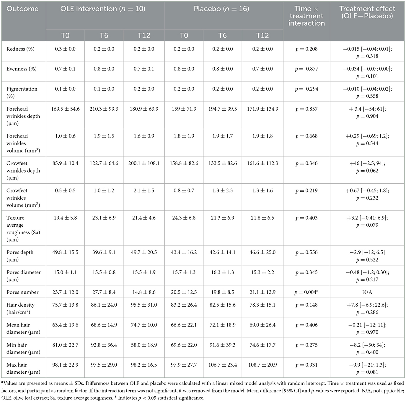 The exploratory skin analyses revealed a significant reduction in pore number in the OLE group from week 6 to week 12, while the placebo group showed no significant change during this period. Additionally, after 12 weeks of intervention, participants receiving OLE had a significantly lower pore number compared to those receiving placebo. Pore number reflects skin surface microstructure and may be influenced by hormones, sebum production, hydration, and epidermal remodeling (49, 50). A reduction in pore number may indicate smoother skin morphology or improved barrier function.