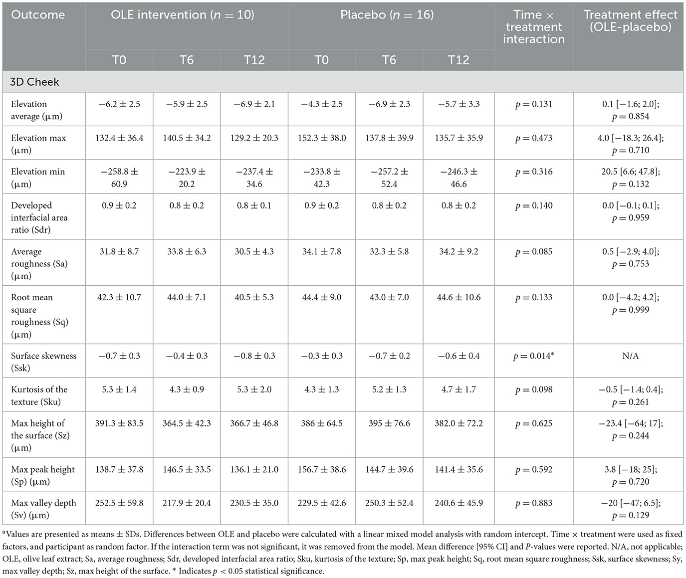 Additionally, surface skewness decreased significantly in the OLE group between 6 and 12 weeks of the OLE intervention, while the placebo group showed no significant change. After 12 weeks, the OLE group had a lower tendency for surface skewness compared to the placebo group. Surface skewness is commonly used to assess skin texture, and describes the asymmetry of the skin surface in terms of height variations, comparing the distribution of peaks and valleys relative to the average plane. Positive values indicate a surface dominated by peaks, while negative values reflect more valleys or indentations.