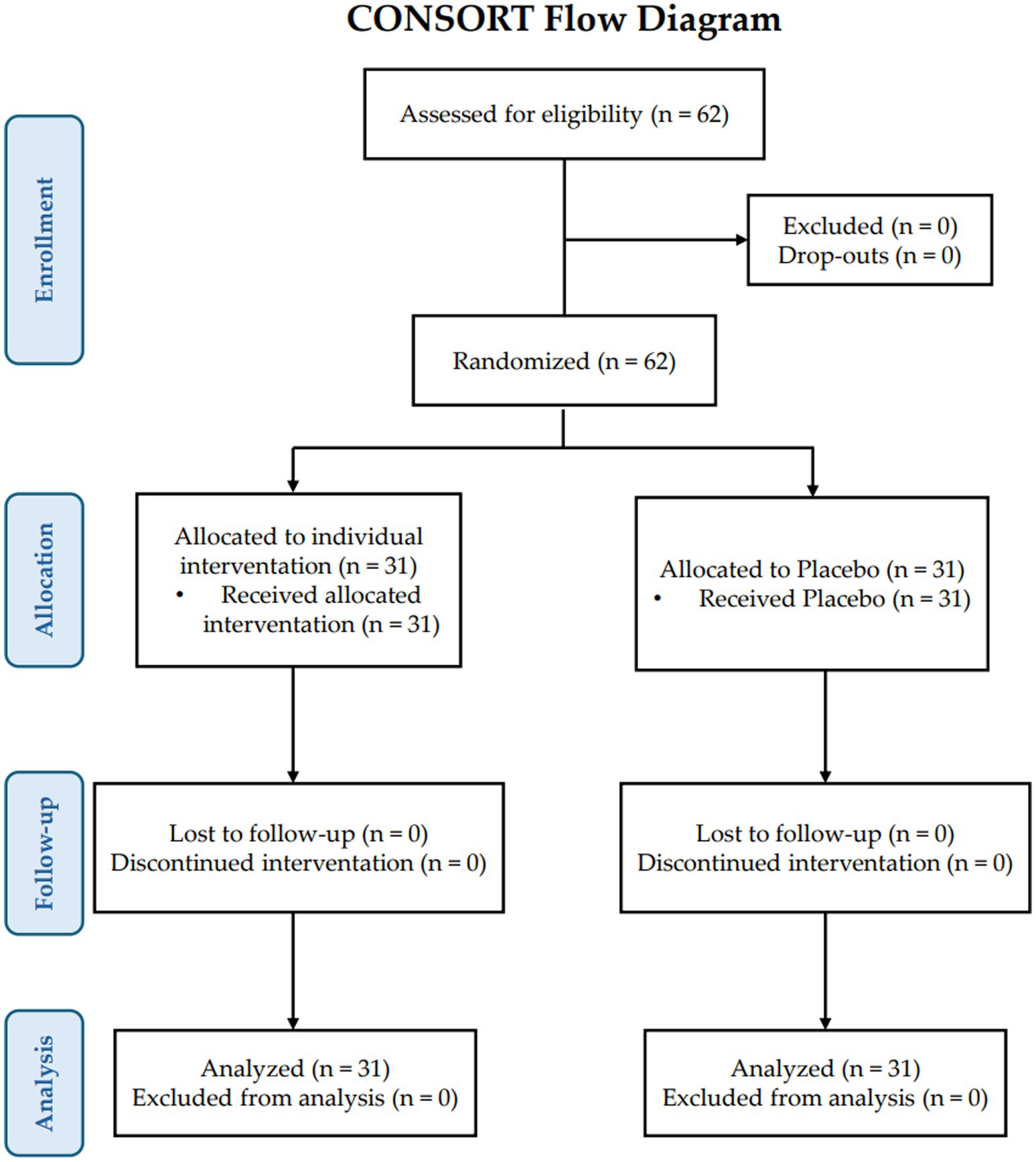 Power analysis, carried out on the interaction between measurement time points and treatment group to verify whether the difference between the placebo (CTRL) and treatment (TRAT) groups varied over time, considered three levels of statistical power (1-β = 0.80, 0.95, and 0.99), a significance level (α) of 0.05, and three levels effect sizes (Cohen’s f = 0.10, 0.25 and 0.40). Based on these parameters, the minimum required sample size was determined to be 54 subjects, with an additional 15% added to account for potential dropout, resulting in a total of 62 participants (31 per group).