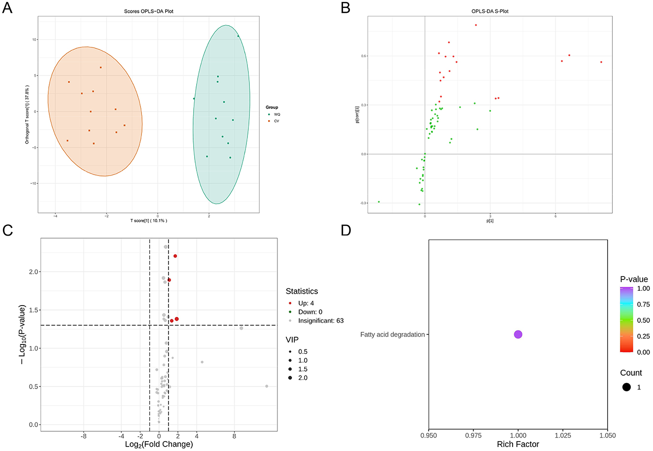 Figure 2. Screening and identification of differential flavor compounds. (A) OPLS-DA score plot. (B) OPLS-DA S-Plot. (C) Screening of differential flavor compounds. Each point in the volcano plot represents a flavor compound. X-axis: Log2foldchange in abundance between two sample groups. Y-axis: VIP (Variable Importance in Projection) value. Larger absolute values on the X-axis indicate greater fold changes. Higher Y-axis values indicate more statistically significant differences. Green points: Down-regulated flavor compounds; Red points: Up-regulated flavor compounds; Gray points: Flavor compounds detected but not significantly different. (D) KEGG functional annotation and pathway enrichment analysis of differential flavor compounds. X-axis: Rich Factor for each pathway. Y-axis: Pathway names (sorted by P-value). Point color reflects P-value (redder indicates higher significance). Point size represents the number of enriched differential flavor compounds.