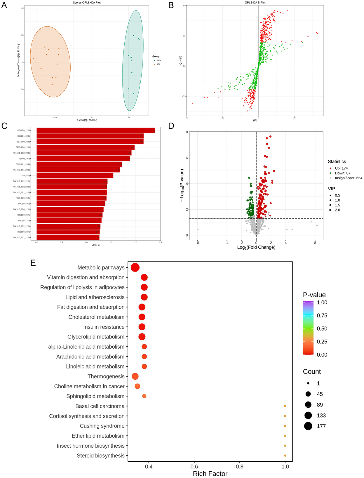 Figure 4. Screening and identification of differential lipids. (A) OPLS-DA score plot. (B) OPLS-DA S-Plot. (C) Bar plot of differential lipids. X-axis: Log2FC (Log2Fold Change) of differential lipids. Y-axis: Differential lipids. Red: Up-regulated lipids; Green: Down-regulated lipids). (D) Volcano plot of differential lipids. (E) KEGG functional annotation and pathway enrichment analysis of differential lipids.
