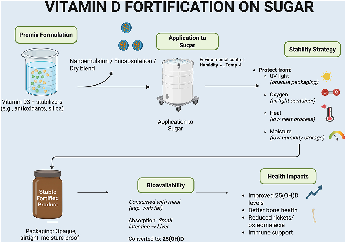 Taken together, enriching sugar with vitamin D presents a promising nutritional intervention, provided it is executed with careful planning and rigorous oversight (Figure 1). The stability of vitamin D within sugar can be well maintained during storage, especially when destabilizing factors such as ultraviolet light, air exposure, heat, and humidity are effectively controlled (Figure 1). Sugar itself does not directly degrade vitamin D; in fact, under optimal storage conditions, over 90% of the vitamin can remain intact throughout the product's shelf life. Moreover, vitamin D delivered through fortified sugar remains bioavailable and has been shown to effectively elevate the body's vitamin D status, as evidenced by successful food fortification programs that have significantly increased population serum 25(OH)D levels (13, 18, 20).