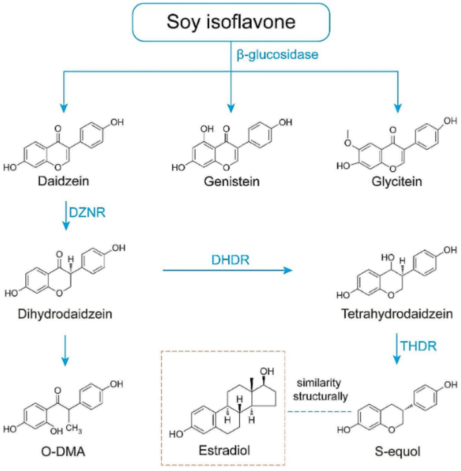 Figure 1. Schematic representation of equol biosynthesis and the similarity of equol to estrogen. DZNR: Daidzein Reductase; DHDR: Dihydrodaidzein Reductase; THDR: Tetrahydrodaidzein Reductase.