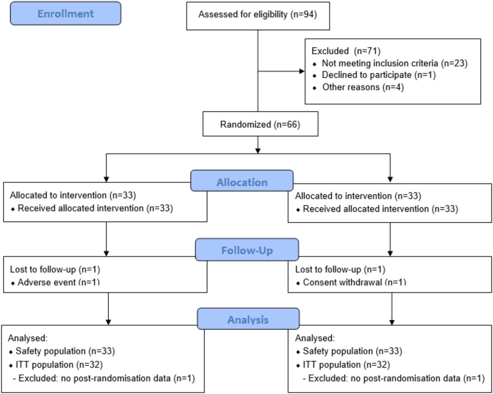 This triple-blind, randomized parallel-arm placebo-controlled pilot trial was conducted in Villeurbanne, France at Eurofins Laboratoire Dermscan. The study protocol and participant consent were reviewed and approved by the ethics committee from the Comité de protection des personnes Est I, Dijon, France (2023-A01033-42). The study was conducted in accordance with the Declaration of Helsinki and Good Clinical Practice (GCP) and registered at www.clinicaltrials.gov (NCT06047145). Written informed consent was obtained from all participants. Participants were randomly allocated to intervention arms on a 1:1 ratio, stratified by smoking status, using random permuted blocks of n = 2 generated using SAS v9.4. Given the small number of smokers enrolled, no subgroup analysis by smoking was performed. The intervention was in the form of capsules containing 200 mg Novasoy®400 (ADM, Illinois, USA), providing 80 mg soy isoflavones in glycoside form. Placebo capsules contained microcrystalline cellulose and were matched in taste, size and appearance. All capsules were manufactured in ADM’s facility in Somerset, UK. Participants were instructed to take one capsule daily in the morning for 12 weeks (84 days). Compliance was monitored through daily logs and capsule counts at each visit. Study visits occurred at screening, baseline (Week 0 or D0), mid-point (Week 6 or D42) and end-of-intervention (Week 12 or D84). Skin assessments were performed at each visit on the right-hand side of the face by trained personnel using calibrated equipment. Participants were asked not to apply any product to the test areas from the previous evening. On D0 first morning mid-stream urine samples were collected and then subsequently at each visit and stored at −20 ⸰C until analysis. A validated soy food frequency questionnaire (FFQ) was administered at Week 0 as an estimate of habitual soy food consumption (21). In total, 94 individuals were assessed for eligibility and 66 participants were randomized to either Novasoy®400 or placebo. A CONSORT diagram is presented in Figure 2. Any adverse events of the intervention were noted throughout the study.