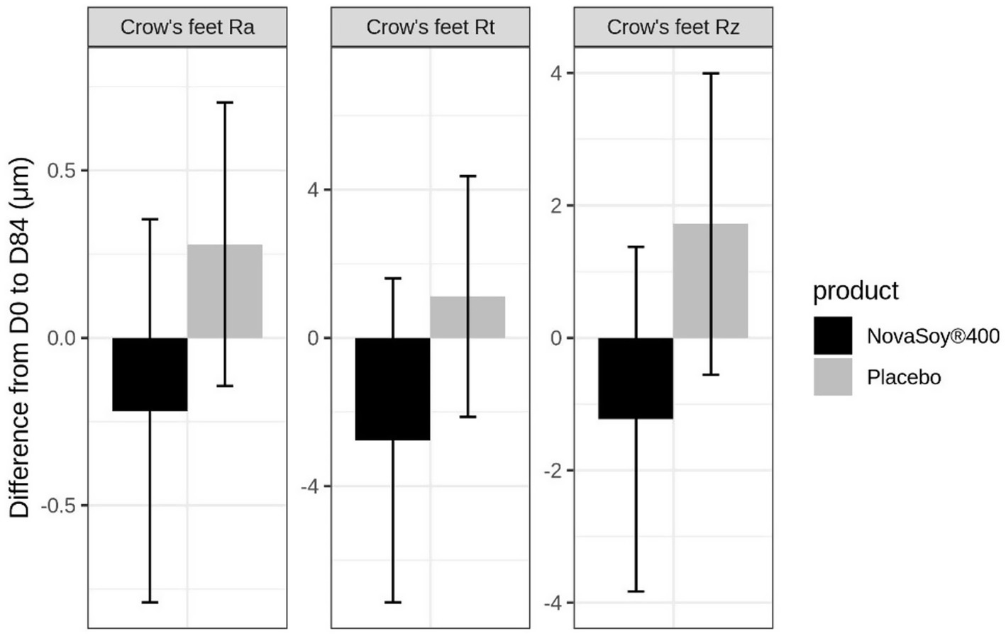 Methods: Sixty-six postmenopausal women received either Novasoy®400 (n = 33), a soy isoflavone extract, or identical placebo (n = 33) for 12 weeks. Skin parameters, including crow’s feet and under-eye wrinkles, hydration, barrier function, and skin colour were assessed at baseline, D42 and D84. Urinary isoflavone metabolites, including S-equol, were measured at each time point.