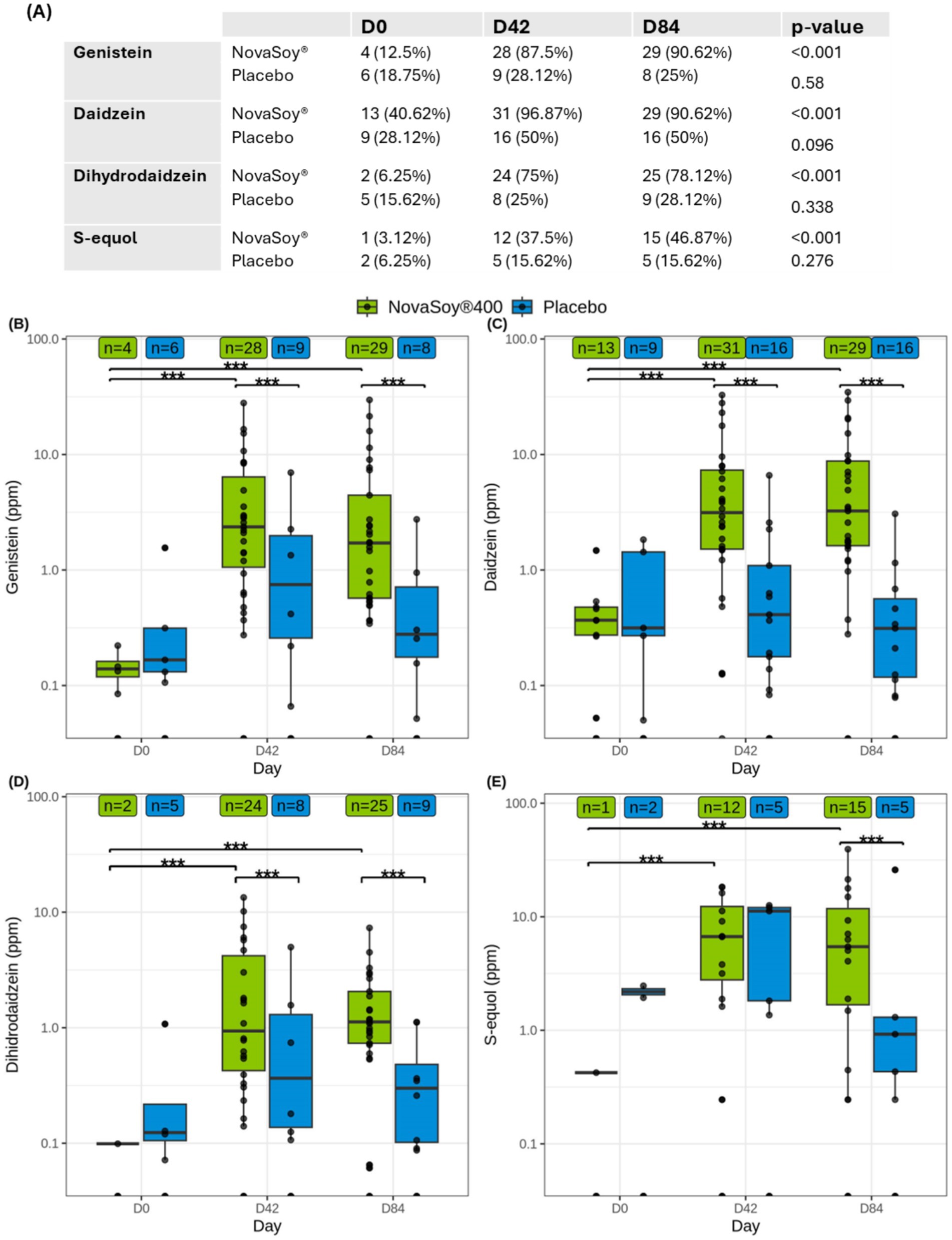 Figure 4. (A) Number and percentage of participants with detectable levels of genistein, daidzein, dihydrodaidzein, and S-equol in urine at different visits (D0: day 0, D42: day 42, D84: day 84) by group. Statistical significance in the proportions across different time points was assessed using the Cochran test. Concentrations of (B) genistein, (C) daidzein, (D) dihydrodaidzein and (D) S-equol in urine at different visits (D0: day 0, D42: day 42, D84: day 84) by group. Statistical significance between different time points and the baseline (D0), or between groups was assessed using the Mann–Whitney-Wilcoxon test. n: Number of subjects with detectable metabolites at each time point and group. *p < 0.05, **p < 0.01, ***p < 0.001.